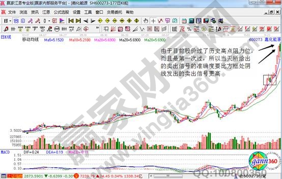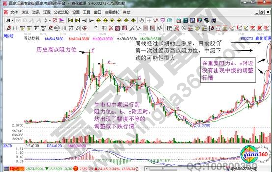 當然在實戰操作過程中,我們要知道,買進一只上升通道下軌附近的股票后,它的第一阻力位在近期的高點附近,此阻力位阻力很小,第二阻力位在上升通道的上軌附近,該處會有一定的阻力,第三阻力位是前期熊市下跌階段的下一個重要阻力位,即下跌過程中某一平臺或反彈高點,這才是真正的重要的阻力位。當周線過了前期熊市的某一重要阻力位后,所形成的波段賣點準確度會大大提高,所過的阻力位越高,那么形成的波段賣點就越準確。如下面的嘉化能源走勢圖。