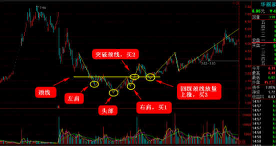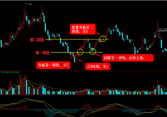 3)突破頸線之后,上漲一波之后回落,回落之后并不會跌破頸線,之后再次量能配合放量上漲,成為第三個買點;