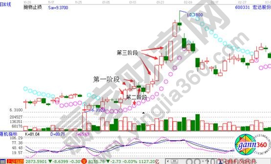 1、股價上穿圓圈為第一階段,之后回落為第二階段,最后企穩上升是第三階段。