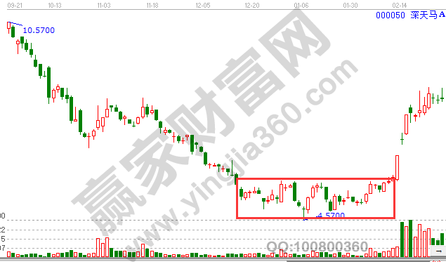 股價在經過一波下跌之后,在下跌行情的后期開始在低位震蕩筑底。如果股價股價進行震蕩筑底所持續的時間比較長,并且成交量也在不斷的增加,那么就表示主力在這個震蕩的過程中不斷的吸籌,而市場很有可能會以“時間換空間”的方式將上漲趨勢的第一波漲幅給消耗掉。同時股價一旦選擇向上,那么就會快速放量突破前期震蕩的高點,然后進行一波漂亮的上漲趨勢。