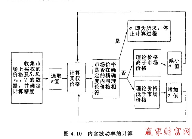由于從該模型不能直接簡(jiǎn)單地解出標(biāo)準(zhǔn)差,我們要用試錯(cuò)法依次對(duì)δ取值,代入公式計(jì)算,直至使公式得出的理論價(jià)格與期權(quán)市場(chǎng)價(jià)格相等的δ值產(chǎn)生,這就是所求。圖4.10表示的是內(nèi)含波動(dòng)率的求解順序。