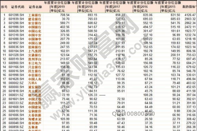 在2015年到2019年的五年之間,a股上市公司的分紅排在前面的公司分別是工商銀行、建設銀行、農業銀行、中國銀行、中國石化、中國平安、中國神華、中國石油、招商銀行、上汽集團等。