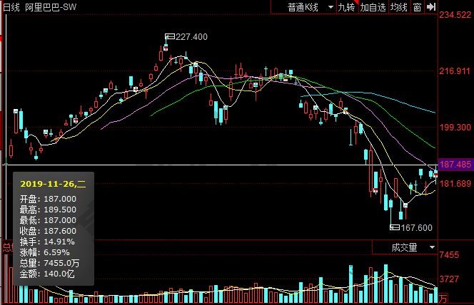 上市首日,阿里巴巴股票開盤價是187.000港元,最高價是189.500港元,最低價是187.000港元,當日收盤價是187.600港元,換手率達到14.91%,首日股價漲幅是6.59%。