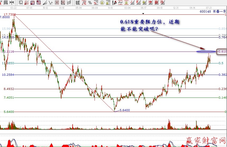 以上證個股長春一東(600148)為例,我們根據(jù)不同的選點做出該票在歷史上重要波段,并驗證黃金分割位的重要性。