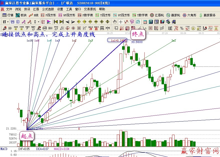 首先,我們要先確立起點,在上升趨勢中選擇行情的最低起點,在下降趨勢線中選擇下跌行情開始時的最高點。其次,我們要開始確立終點,在上升趨勢中選擇行情的最高點,在下降趨勢中選擇行情的最低點。最后,我們將起點和終點連接起來,則自動產生了其他角度的線條。