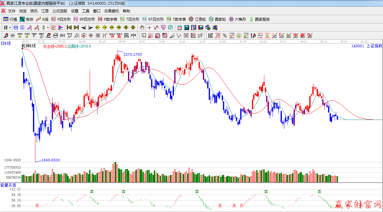 ☆依據(jù)贏家江恩系統(tǒng)乾坤K線提示:處于藍(lán)色休息區(qū)域,出局線下方,看空。