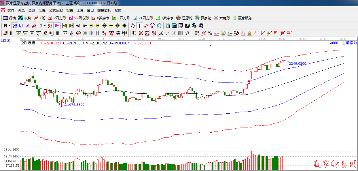 ★依據贏家江恩系統極反通道提示:創出近期新高,極反通道紅色外軌阻力是 2260附近。