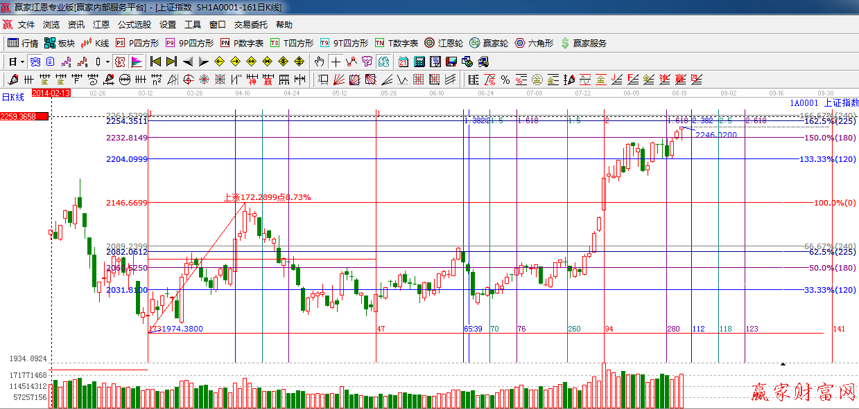 江恩看盤綜述:依據贏家江恩技術工具分析得出:大盤探底回升,再創年內新高,量能上保持穩定增長,預計仍將維持震蕩上揚的格局,短期需關注外軌線2260點附近,操作上,把握好題材熱點輪動的投資機會。