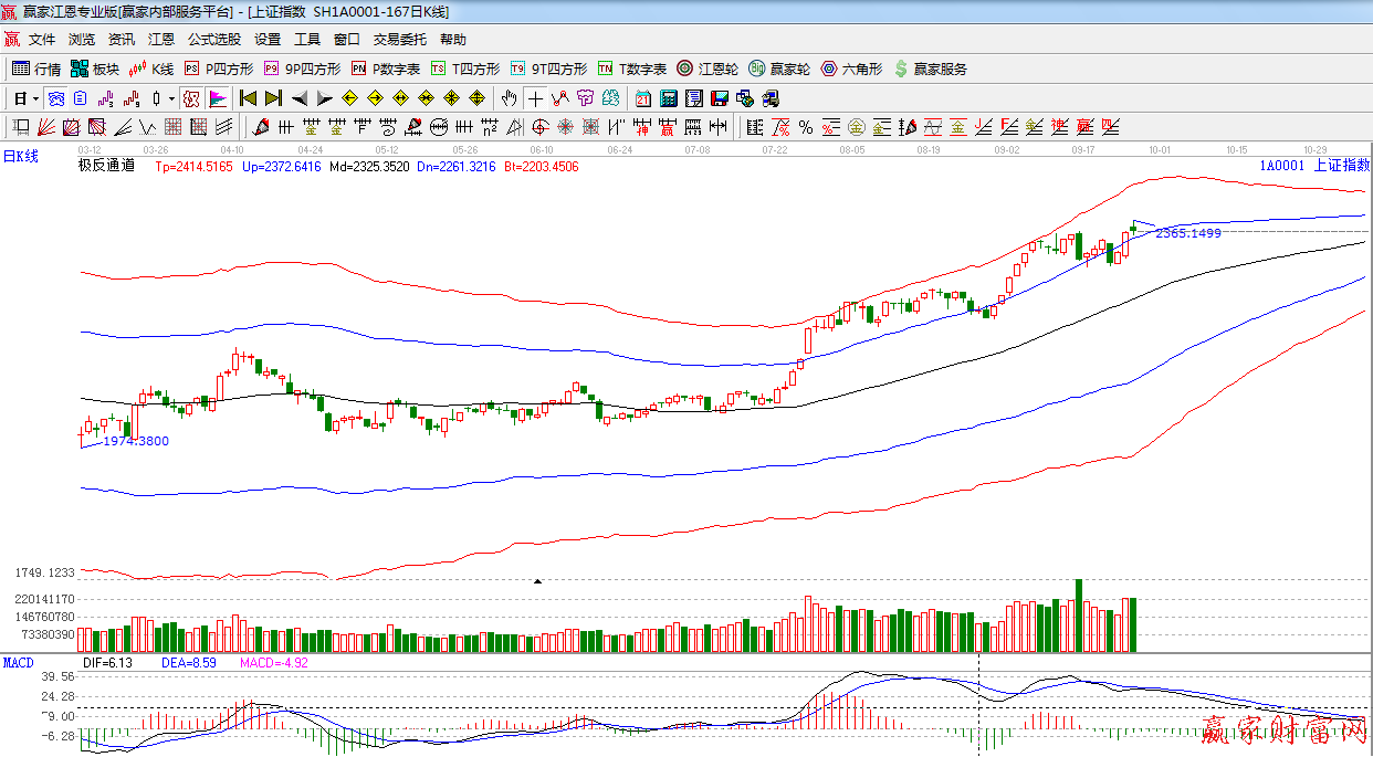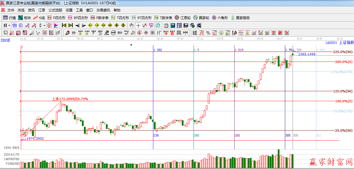 江恩看盤綜述:依據(jù)贏家江恩技術(shù)工具分析得出:今日25日是前期一直提到的時間之窗,午后指數(shù)縮量創(chuàng)出新高2365點(于昨天提到的2362點僅僅相差3點),最后在權(quán)重的拖累下迅速回落,十字星報收,明日繼續(xù)關(guān)注江恩90度2362點強阻力,此關(guān)鍵位置需要謹(jǐn)慎對待,如不能放量突破,將引來短期轉(zhuǎn)折點,操作上,以控制倉位為宜。