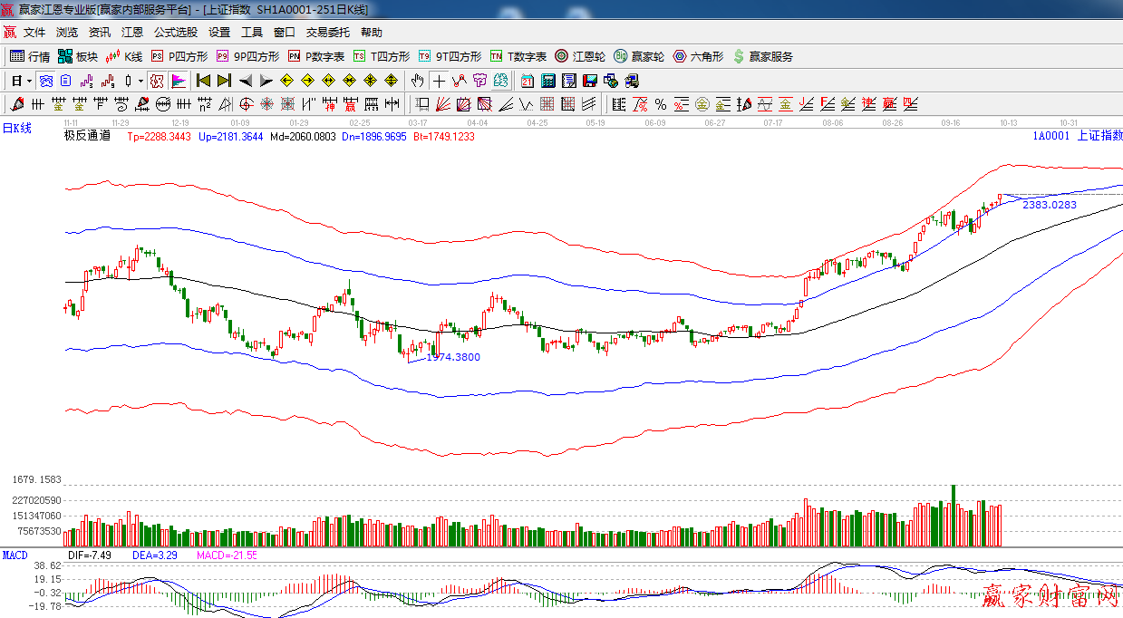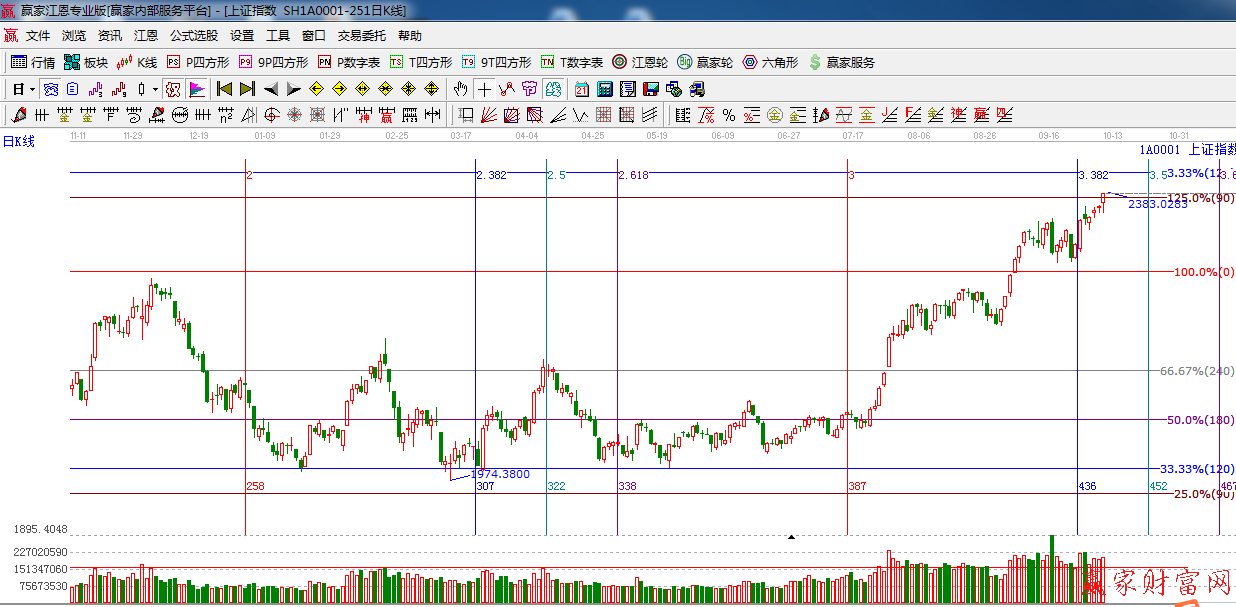 江恩看盤綜述:依據贏家江恩技術工具分析得出:滬深兩市貼著極反通道外軌線震蕩上揚,今日滬指刷新20個月來新高,依據規則藍色外軌線不破,后期趨勢繼續向好,明日關注90度2376點支撐,此位置整理不破看高一線,江恩120度2411點。