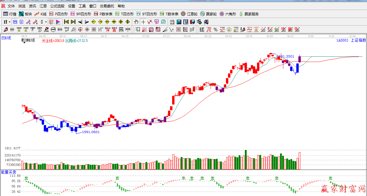 ☆依據贏家江恩系統乾坤K線提示:指數從下向上突破紅色關注線,k線由藍色轉變為紫色警示線,短期謹慎看多。
