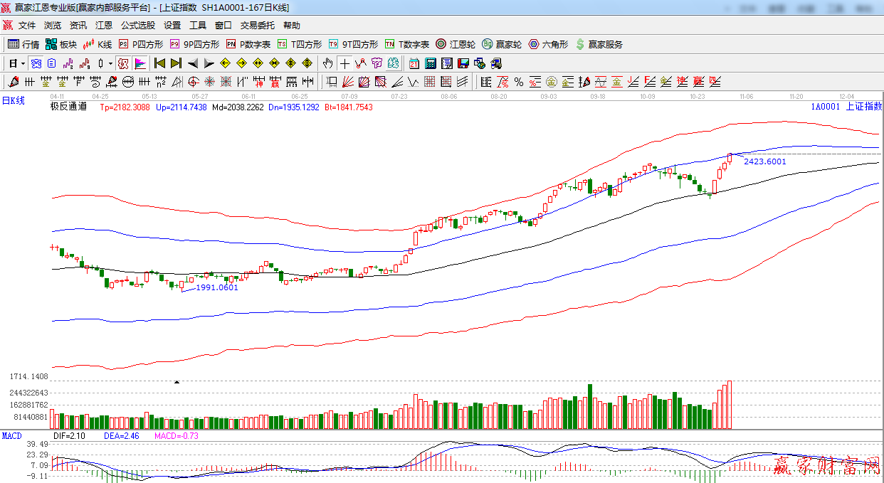 極反通道提示:指數(shù)繼續(xù)放量上行,突破藍(lán)色外軌2410點(diǎn),留意后期量能,如不能支持,此位置將仍有反復(fù)。