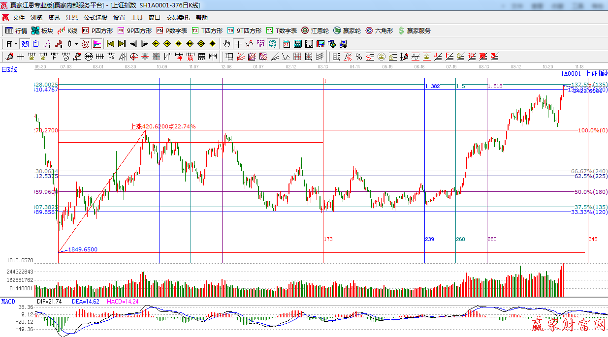 ☆依據(jù)贏家江恩系統(tǒng)波段百分比提示:指數(shù)繼續(xù)震蕩走高,強(qiáng)勢(shì)突破120度2410點(diǎn),下一目標(biāo)位是135度2428點(diǎn),180度是2480點(diǎn)。