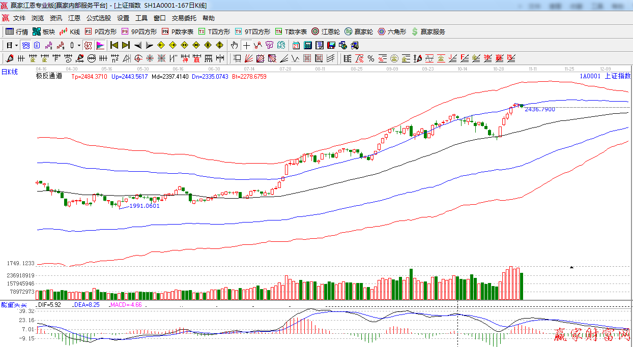 ★依據(jù)贏家江恩系統(tǒng)極反通道提示:今日收盤破位藍色外軌線,短期注意風(fēng)險。