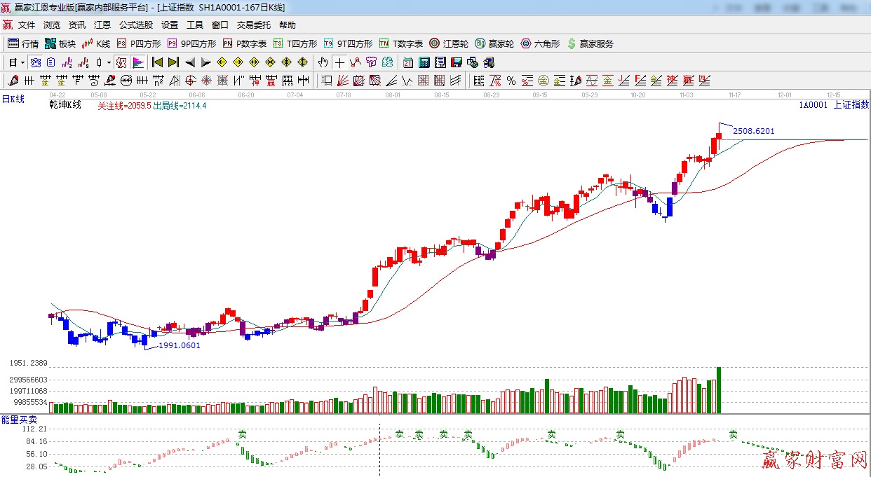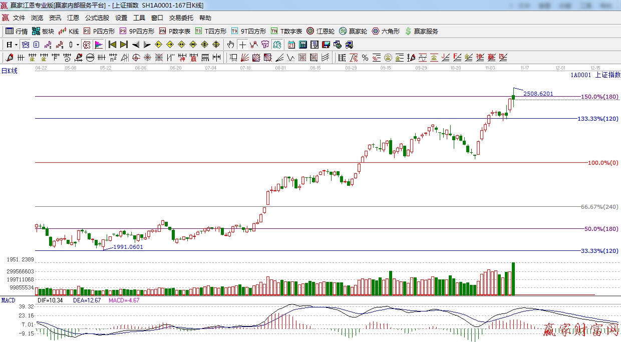 江恩看盤綜述:依據贏家江恩技術工具分析得出:高位放量陰十字星報收,收盤收在2480點之下,180度2480點,明日繼續關注此位置的爭奪,如不能收復,短線有面臨回落風險,下方支撐120度2410點,本月重要時間窗口在11月24日,操作上,有盈利個股注意逢高兌現,漲幅過大,要注意其殺跌風險。
