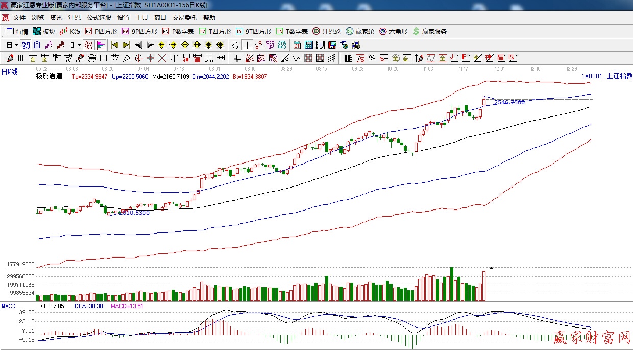 ★依據贏家江恩系統極反通道提示:指數直接跳空高開突破藍色外軌線,進入超強區域,短線強勢。
