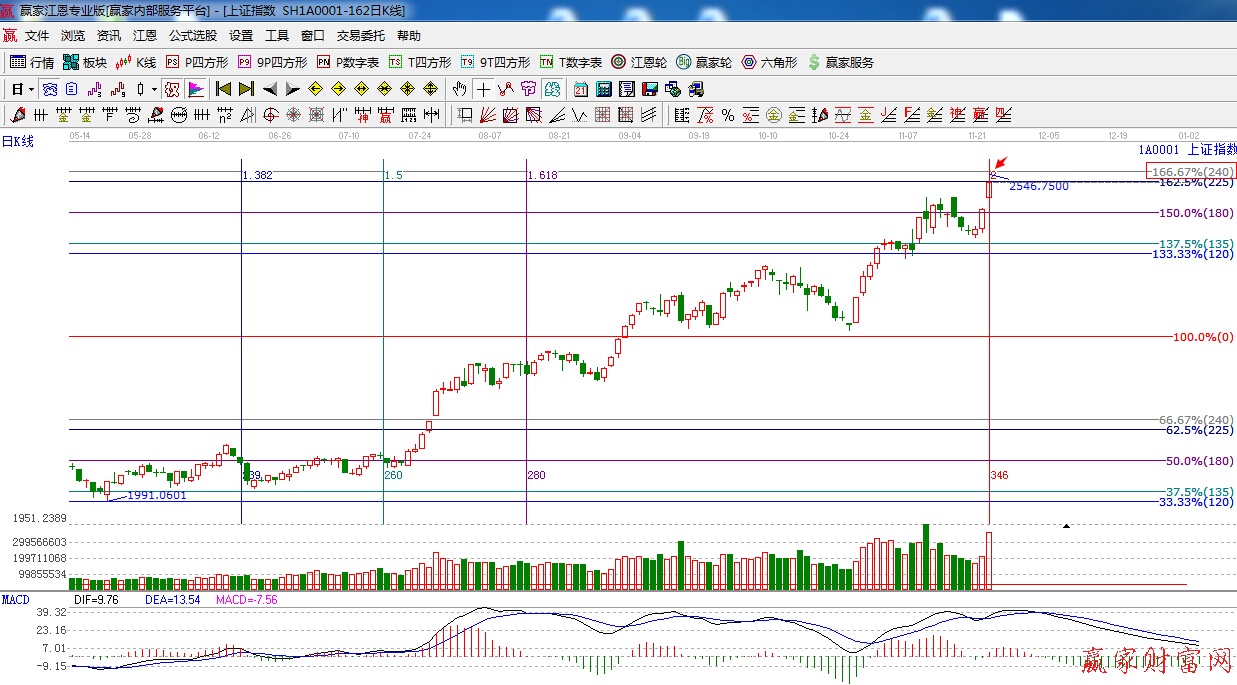 ☆依據贏家江恩系統波段百分比提示:跳空強勢上攻,午后在昨天提到的240度2550點附近遇阻,高位震蕩,明日依然關注此位置強阻力。