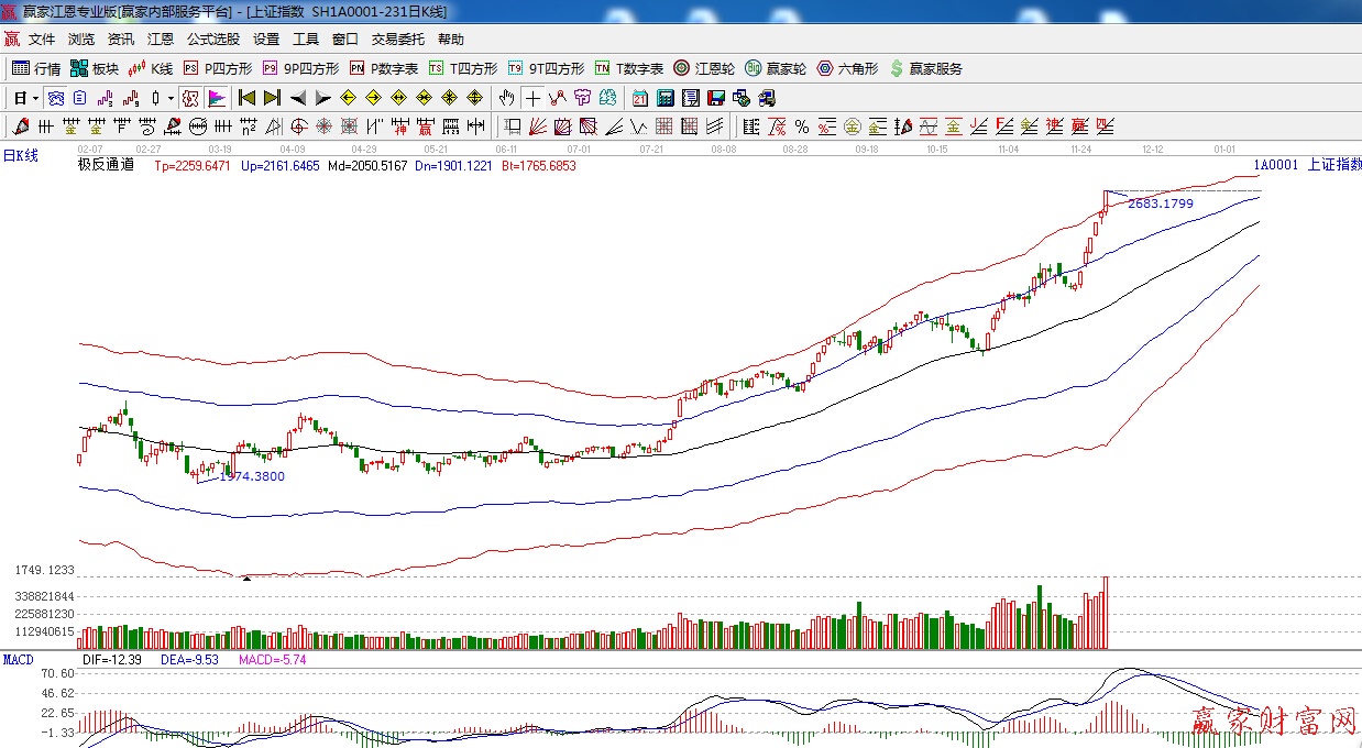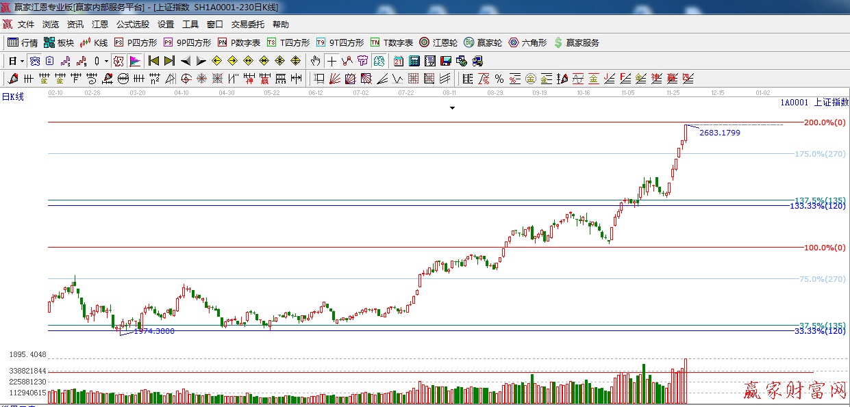 江恩看盤綜述:依據贏家江恩技術工具分析得出:銀行接力券商引領大盤強勢上攻,運行至極反通道紅色外軌線,此時應多加謹慎,隨時注意回調風險,另外價格分析200%位置2690點,是本周需要注意的點位,預計本周指數整體以高位震蕩為主。