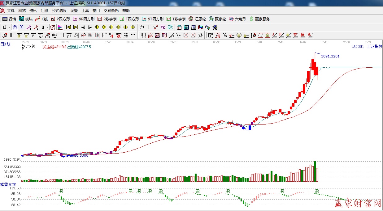 ☆依據贏家江恩系統能量買賣提示:紅色柱子較前期紅色柱子有背離,處于多空臨界點,謹慎為主。