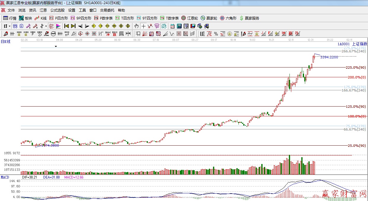 今日滬深兩市受外圍影響雙雙低開逾1%,小幅下探后迅速回升,上證指數在銀行股推動下,沖擊3400點,隨后煤炭、地產、券商、保險等權重板塊展開回落,創業板指數暴漲5%,盤面上,鐵路運輸、計算機應用、醫療器械、水務等題材股全線爆發,保險、地產、煤炭等板塊跌幅居前,截止收盤,漲停個股達60只,跌停1只,今日市場主板呈現寬幅震蕩,創業板下探年線反彈,目前滬指將面臨歷史重要點位3478點,此位置附近心理上出現一些壓力,很正常,依據贏家江恩軟件分析上方面臨江恩阻力位是240度—270度(3440—3490點),今日滬指逼近3400點整數關,也就基本完成了牛市初期第一波主升浪的90%,但這只是第一階段,整理后會有更大的戲還將繼續上演。