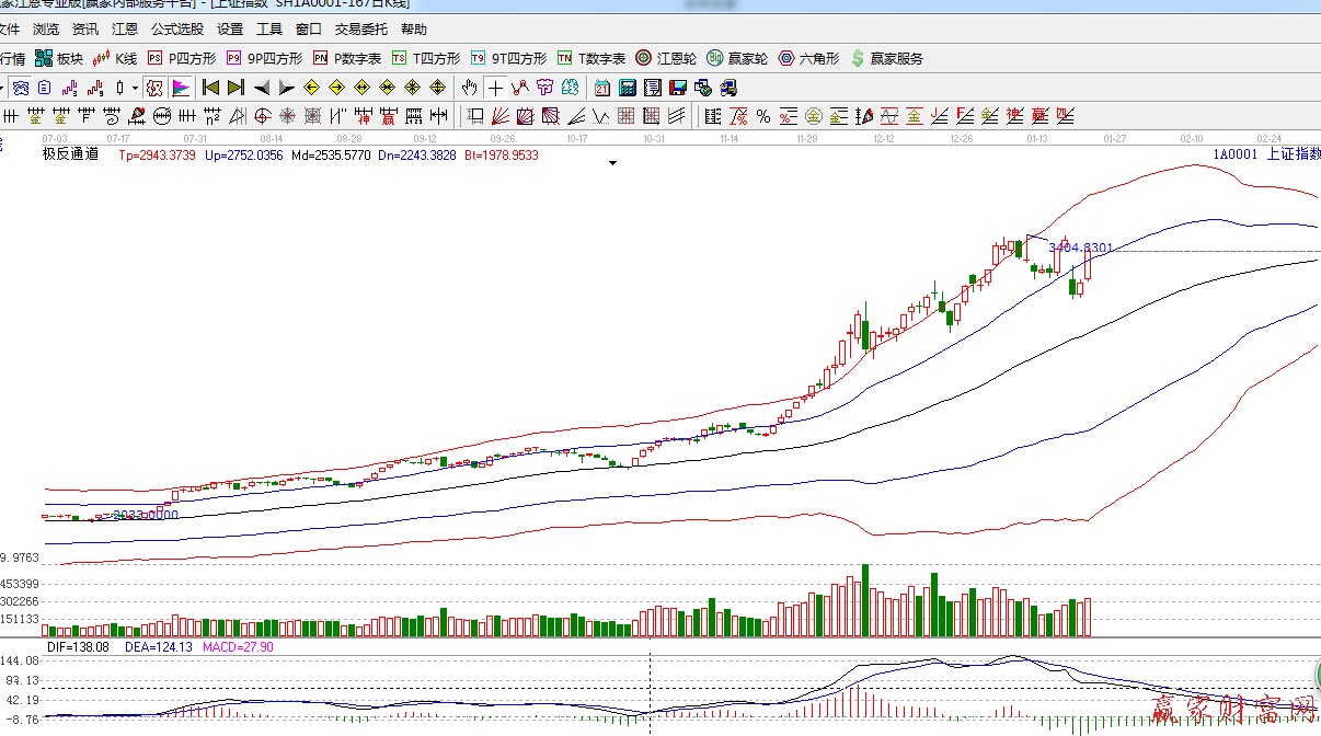 江恩看盤綜述:依據贏家江恩技術工具分析得出:周三滬指早盤跳空突破江恩90度阻力,在金融股的帶領下一路震蕩走高,盤中滬指漲幅一度超5%,金融股的回歸,預示著A股牛市依舊強勢運行中。截止收盤,缺口仍留有3個點未能完全回補,此位置也是江恩180度阻力,明天重點留意此位置的爭奪,操作上:適當留意農業,迪士尼念。