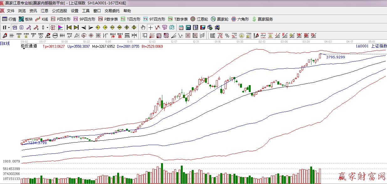 江恩看盤綜述:依據贏家江恩技術工具分析得出:近期指數圍繞江恩0度位置整理,30日是前期提到的時間窗口,滬指如期再次走強,向上攻擊并突破江恩90度位置3783點,創7年新高,總體來看,市場整體強勢不改,依據工具分析,由于上行靠近極反通道紅色外軌阻力線,后期繼續上行可逐步控制倉位。操作上,繼續布局滯漲品種以及年報超預期的個股,對于短線急漲的個股要控制好倉位。