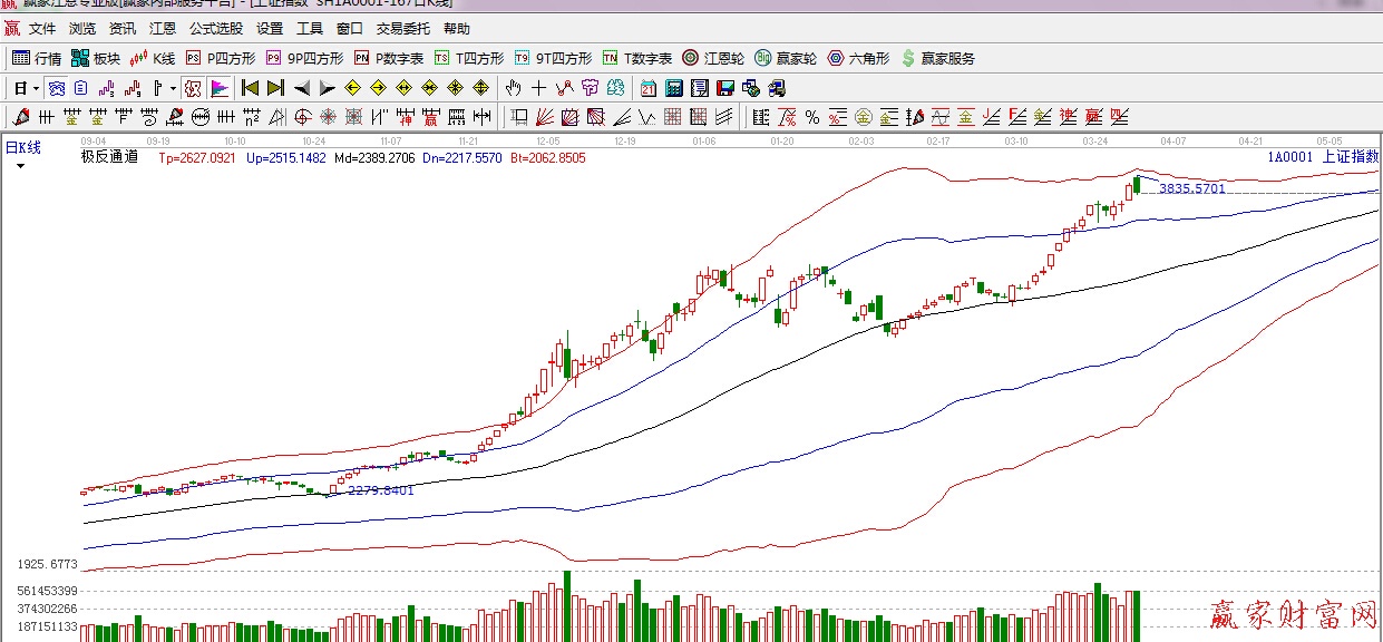 極反通道提示:在利好推動下,滬指大幅高開,但上方面臨紅色外軌線阻力,隨著權重板塊的沖高,股指也逐步回落,短期謹慎看多。