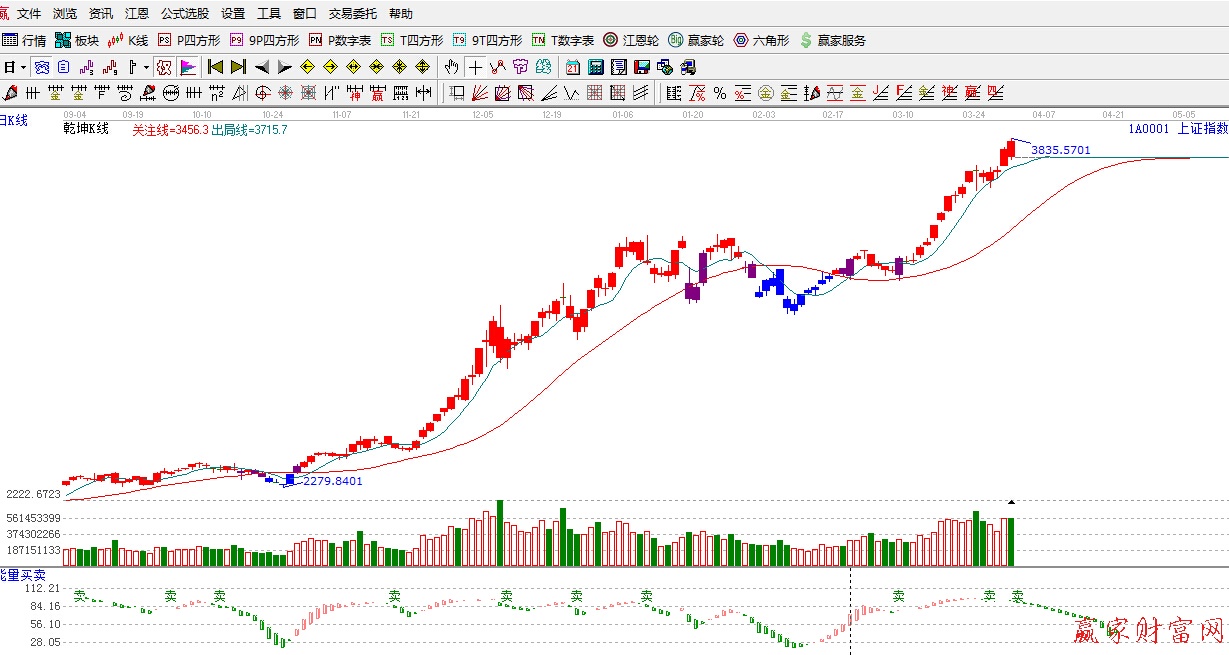 ★依據贏家江恩理論系統乾坤K線提示:紅色k線,綠色線上方,留意綠色短線出局線得失。