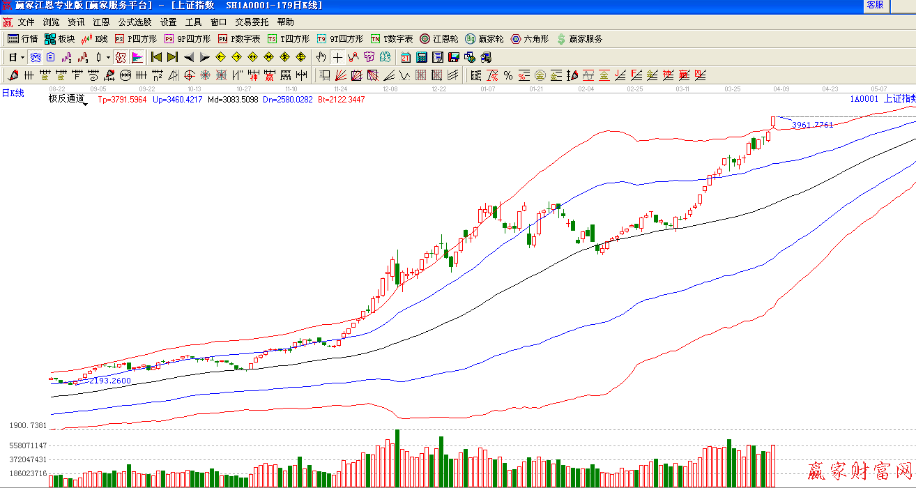 極反通道提示:跳空突破紅色外軌線,震蕩攀升,市場強勢依舊。