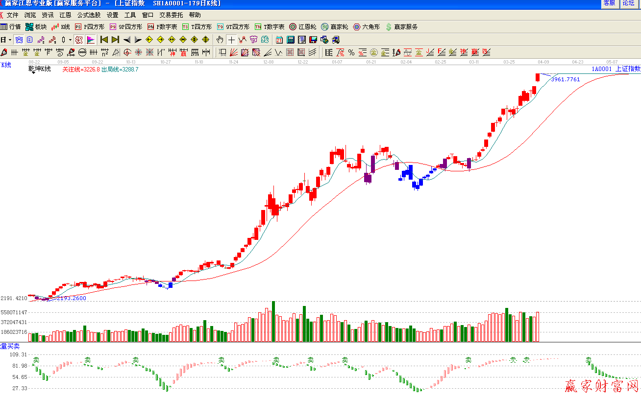 ★依據贏家江恩理論系統乾坤K線提示:紅色k線,綠色線上方,留意綠色短線出局線,綠色線不破,繼續看多。
