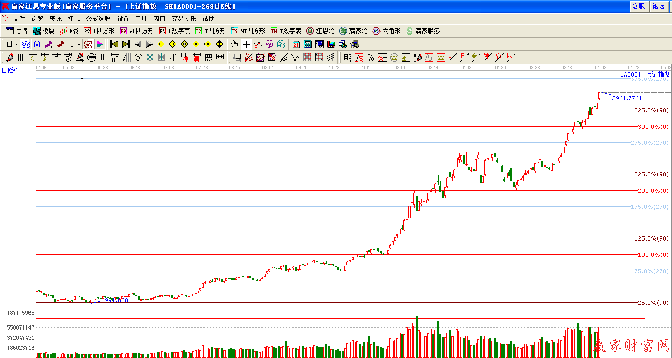 ★依據贏家江恩理論系統波段百分比提示:上一交易日滬指回踩江恩90度3783點附近,繼續震蕩攀升,今日繼續跳空強勢走高,依據規則下一目標位是江恩270度4081點。