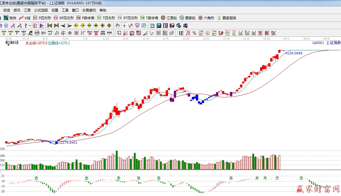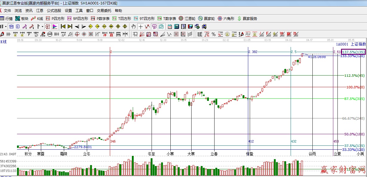 ★依據贏家江恩理論系統波段百分比提示:今日滬深兩市跳空突破江恩120度4082點,下一目標位是135度4157點附近。