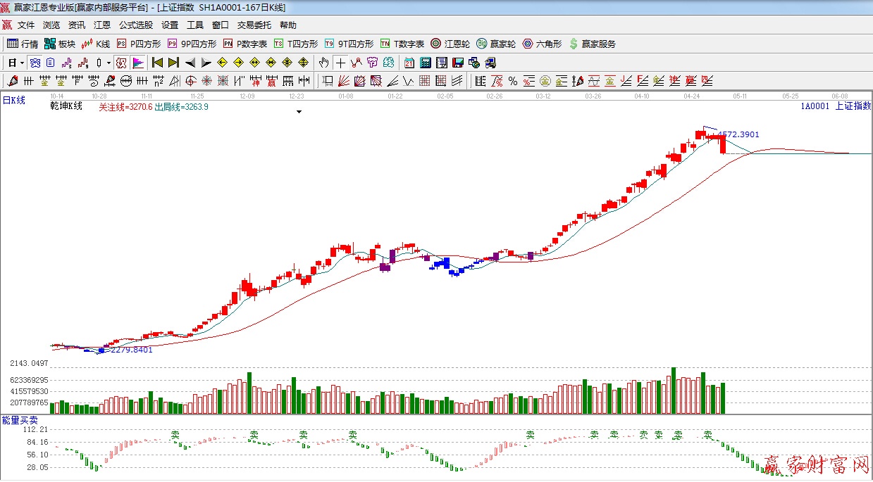 ☆依據贏家江恩理論系統能量買賣提示:有“賣”字出現,綠色能量柱加長,短線看空。