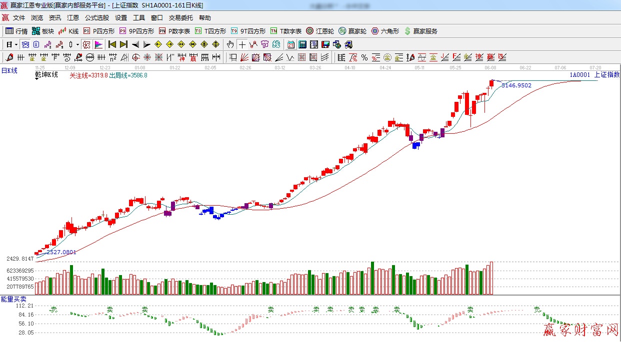 ★依據(jù)贏家江恩理論系統(tǒng)乾坤K線提示:紅色可操作區(qū)域,綠色出局線之上,看多。