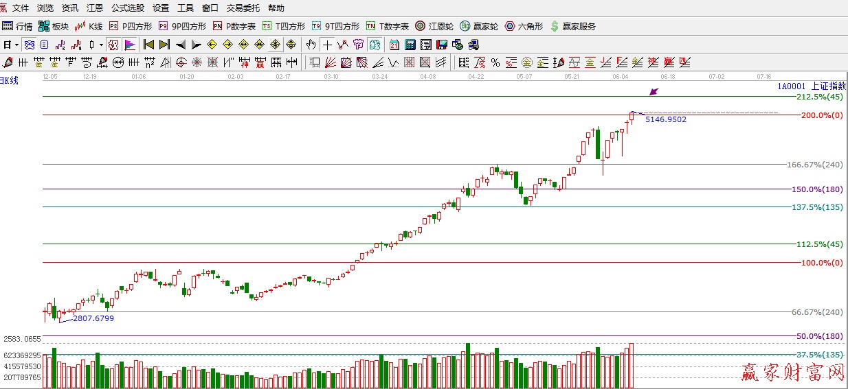 ★依據(jù)贏家江恩理論系統(tǒng)波段百分比提示:滬指在權(quán)重大帶動下站上5100點,下一目標(biāo)是江恩45度5300附近點。