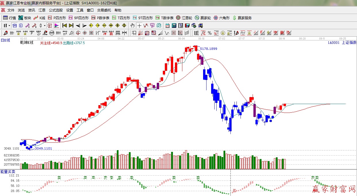 ★依據贏家江恩理論系統乾坤K線提示:紅色關注線之上,k線由紫色轉變為紅色k線,進入可操作區域,看多。