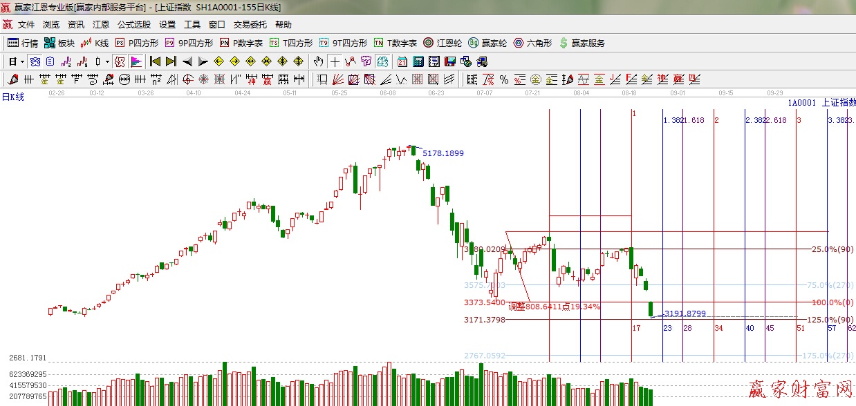 江恩看盤綜述:依據(jù)贏家江恩技術(shù)工具分析得出:周一滬指開盤即跌破前期低點(diǎn)3373點(diǎn),隨繼破位年線,強(qiáng)烈打擊了投資者信心,盤中一度跌逾9%,雖然萬億養(yǎng)老金獲準(zhǔn)入市,也拖不起沒有人氣的市場,技術(shù)面,明日依然關(guān)注江恩90度3171點(diǎn)附近支撐,此位置如破位,短周期將直逼3053--2972附近,日線支撐在江恩270度2767點(diǎn)附近,時間上,8月26日,9月2日。目前A股正處于一個中期夯實(shí)底部過程中,投資者的首要任務(wù)是保護(hù)好資金,等待時機(jī)。