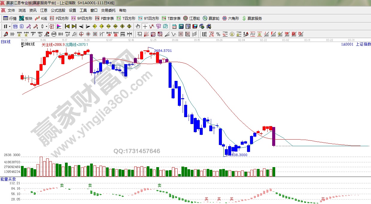 ☆ 依據贏家江恩理論系統乾坤K線提示:紫色警示k線出現,破位紅色關注線,看空。
