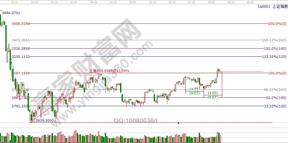 ☆依據贏家江恩理論系統江恩波段百分比線提示:滬指如期震蕩整理,從2638到3097點做波段百分比延伸線,支撐位3095點,3070點。上方阻力位45度線3140點,120度線3250點。