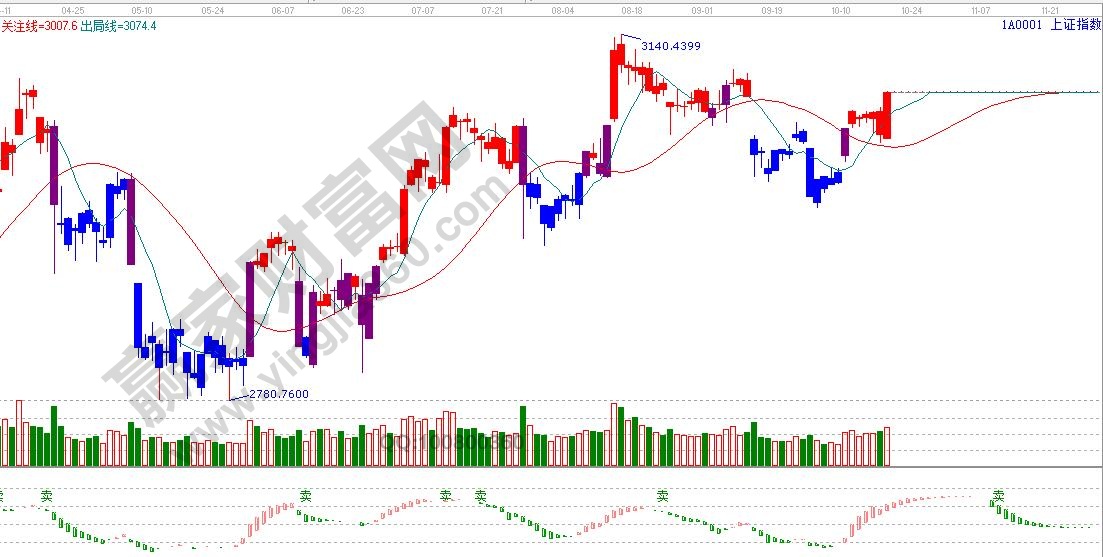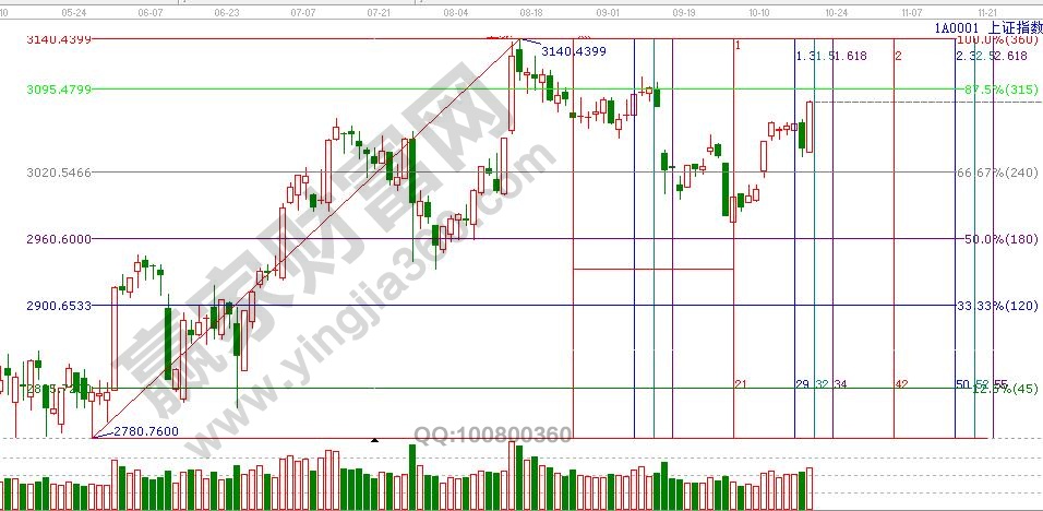 ★依據贏家江恩理論系統極反通道提示:滬指在60分生命線附近止跌回升,藍色外軌線是3096點。