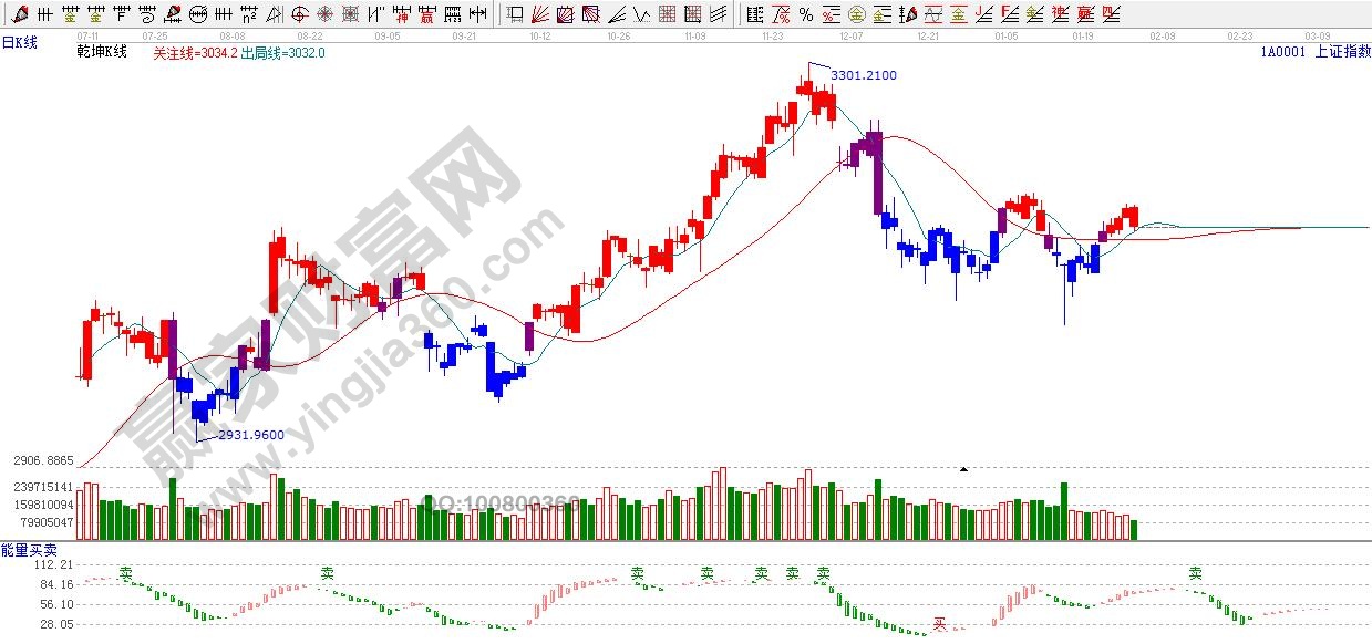 ★依據(jù)贏家江恩理論系統(tǒng)乾坤K線提示:滬指k線由紫色警示k線轉(zhuǎn)入紅色,出局線金叉關(guān)注線,依據(jù)規(guī)則紅色K線看多。