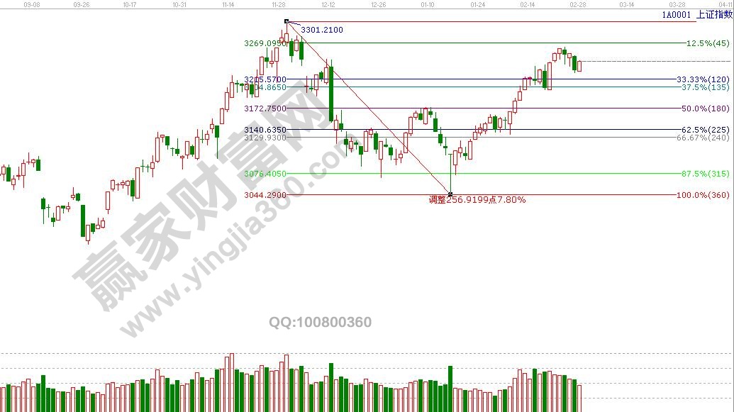 江恩看盤綜述:依據(jù)贏家江恩技術(shù)工具分析得出:周二,滬指縮量調(diào)整,試探60分生命線,由于下方承接力量較強(qiáng),所以整理空間較為狹窄,下方百分比支撐3215點(diǎn),3204點(diǎn)。反抽阻力位3254點(diǎn),另外,周末“兩會”即將召開,按照一慣的維穩(wěn)需求,短時間內(nèi)難以大漲或大跌,市場繼續(xù)維持震蕩的可能性更大。操作上,輕指數(shù),重個股為主,重點(diǎn)關(guān)注國企改革、一帶一路以及軍工等兩會議題板塊。