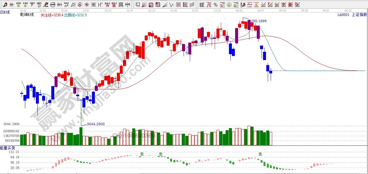 ☆依據贏家江恩理論系統能量買賣提示:“賣”字出現,綠色看空能量柱,依據規則看空。