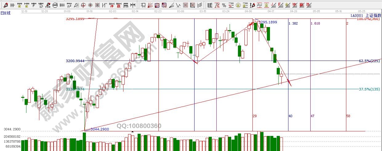 江恩看盤綜述:依據贏家江恩技術工具分析得出:周四,滬指午后小幅跳水,再次回探江恩135度支撐線后回升,昨天分析中已經提到將有短線回抽動作,今日一帶一路以及金融股盤中表現,護盤跡象較為明顯。在此基礎下,股指短期仍有小幅回抽機會,空間上先關注缺口3189--3196點,留意反彈的力度以及成交量的釋放,另外,介于目前整體趨勢處于日線生命線之下弱勢。操作上,輕倉博弈為主,整體倉位5成以下。時間周期,近期4月25日、5月2日。板塊上,波段關注雄安新區,一帶一路、軍工等板塊。