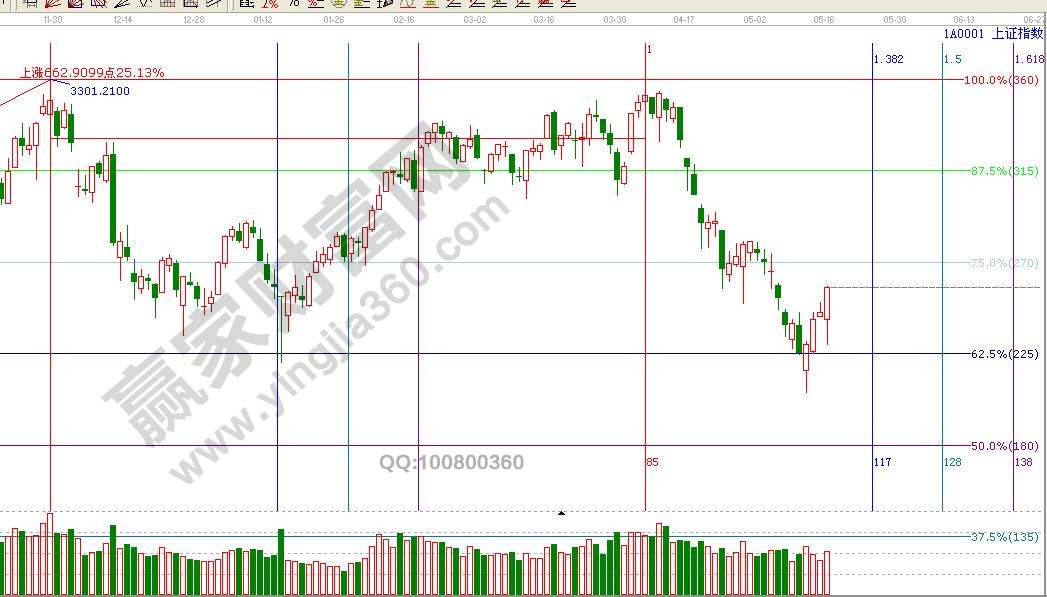 ★依據贏家江恩理論系統江恩波段百分比線提示:早盤滬指下探3060點(距離3052點差8個點)后展開回升,上方阻力依然是270度3135點附近。短線支撐3100點。