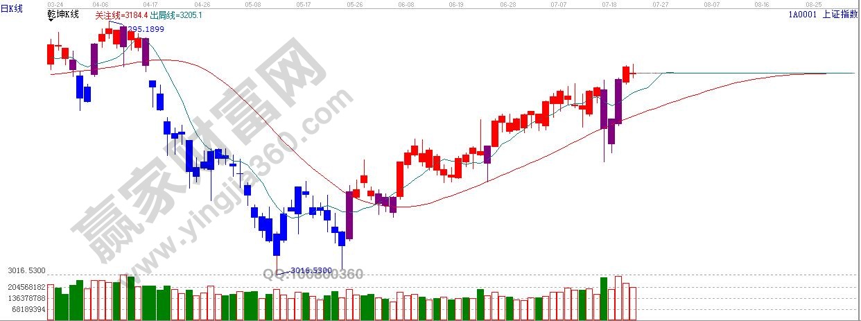 ★依據(jù)贏家江恩理論系統(tǒng)乾坤K線提示:紫色k線轉(zhuǎn)入紅色k線,依據(jù)規(guī)則,看多。