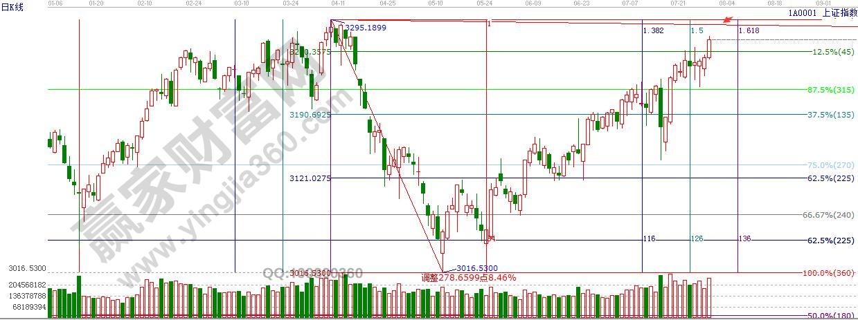 ☆依據贏家江恩理論系統黃金時間周期線提示:寬幅整理后,滬指再次創下新高。下一下窗口8月8日附近。