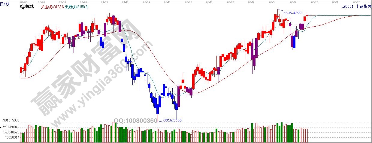 ★依據贏家江恩理論系統乾坤K線提示:滬指由紫色k線,轉變為紅色k線,進入多頭區域,依據規則,看多。