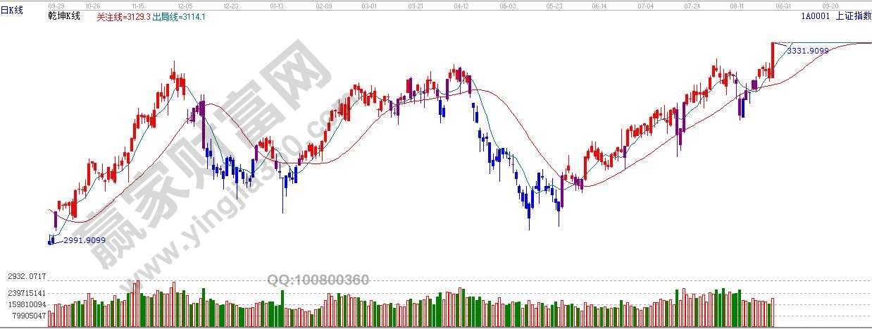 ★依據贏家江恩理論系統乾坤K線提示:滬指由紫色k線,轉變為紅色k線,進入多頭區域,依據規則,看多。