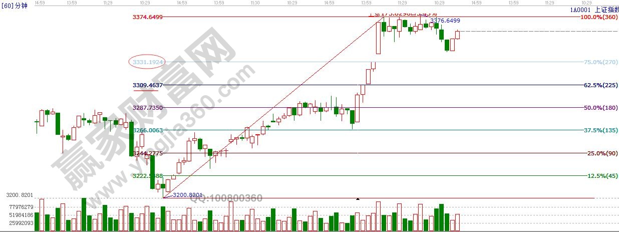 ☆依據(jù)贏家江恩理論系統(tǒng)江恩波段百分比線提示:滬指繼續(xù)在3380點(diǎn)下方整理,盤中回踩3340點(diǎn),下方支撐270度3330點(diǎn)附近,225度3309點(diǎn)附近,短期阻力位是3380點(diǎn)附近。